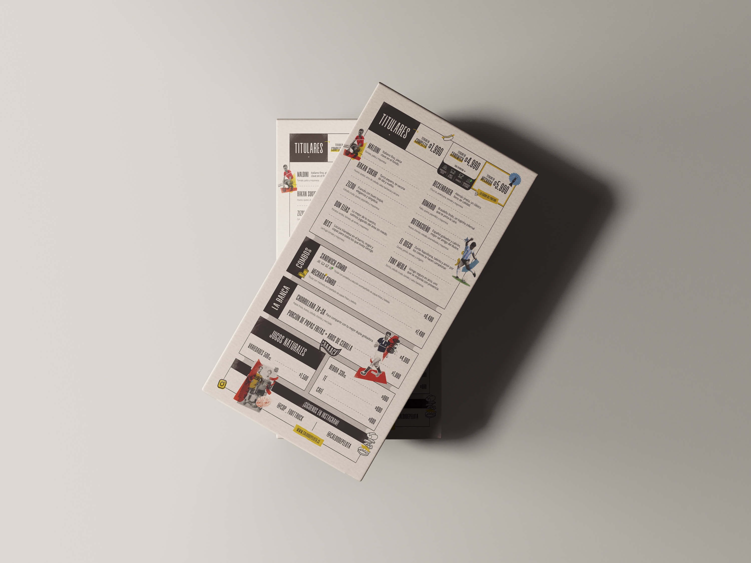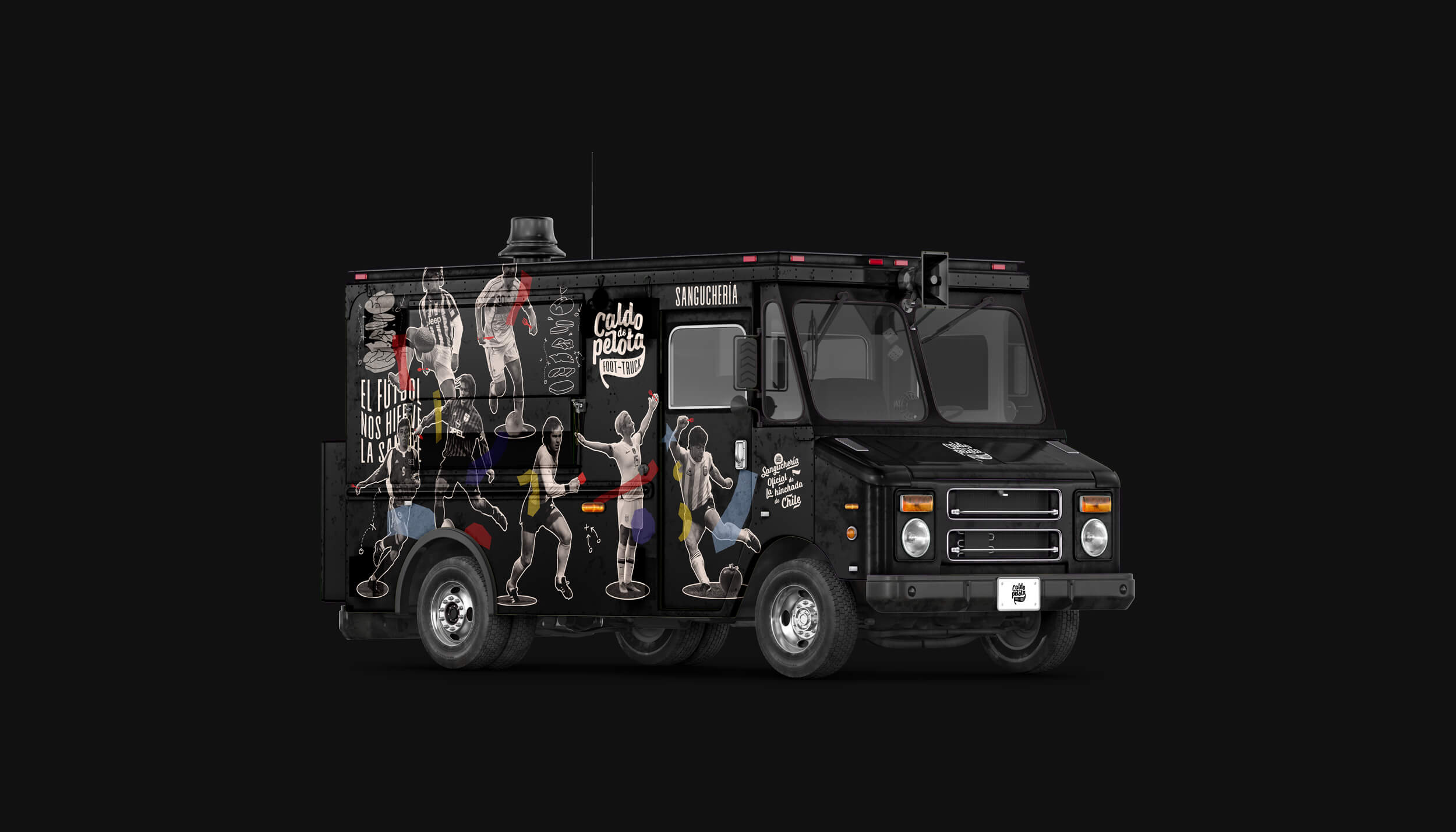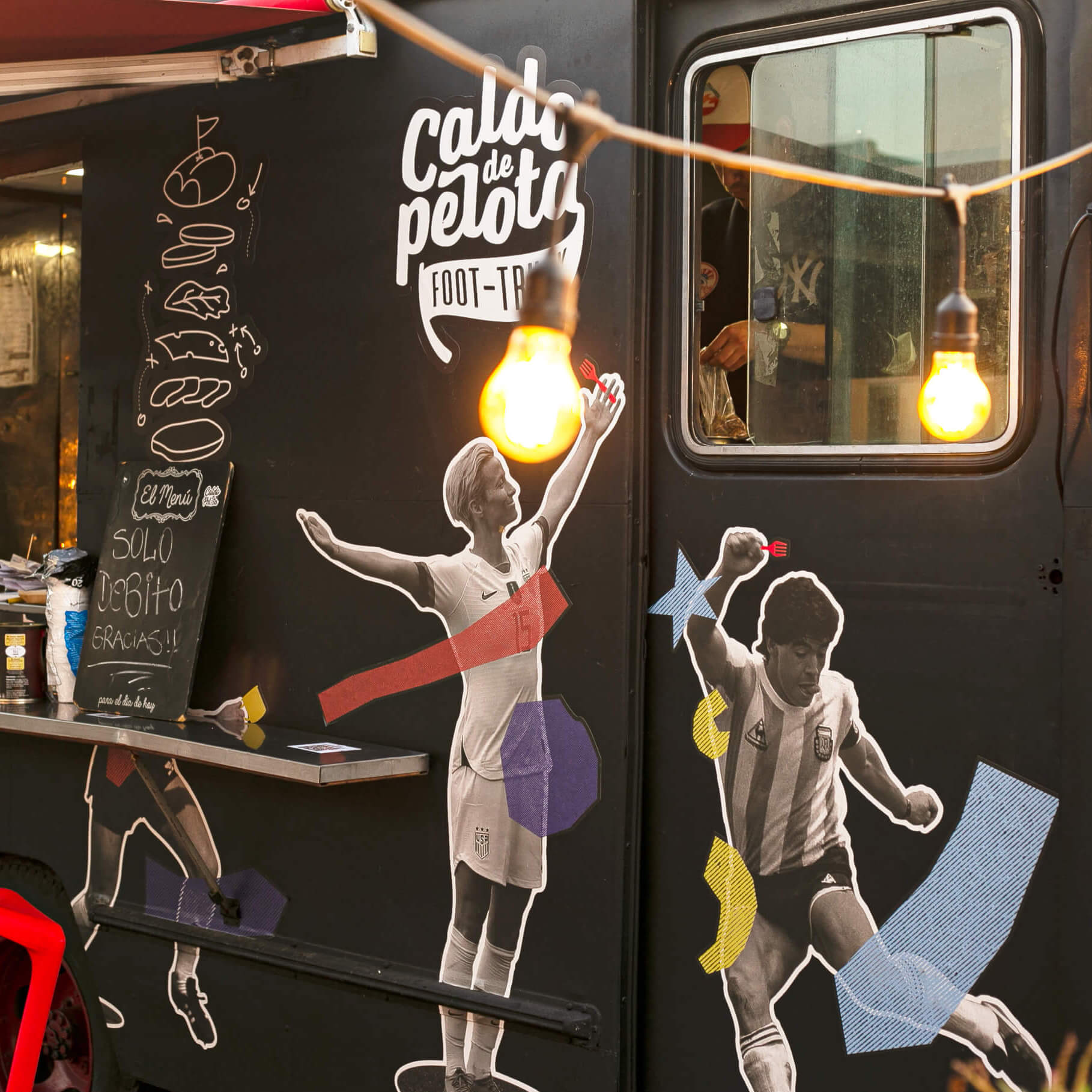 Posteriormente, la marca decidió lanzar un Food Truck bajo el mismo concepto. Para ello se diseñó la gráfica exterior del carro, que exhibe un lenguaje visual distintivo basado en ilustraciones tipo collage, construidas principalmente a partir de recortes de fotografías de la revista “Estadio” (1941–1982) —provenientes de la colección virtual de la Biblioteca Nacional— combinados con imágenes contemporáneas del fútbol mundial.