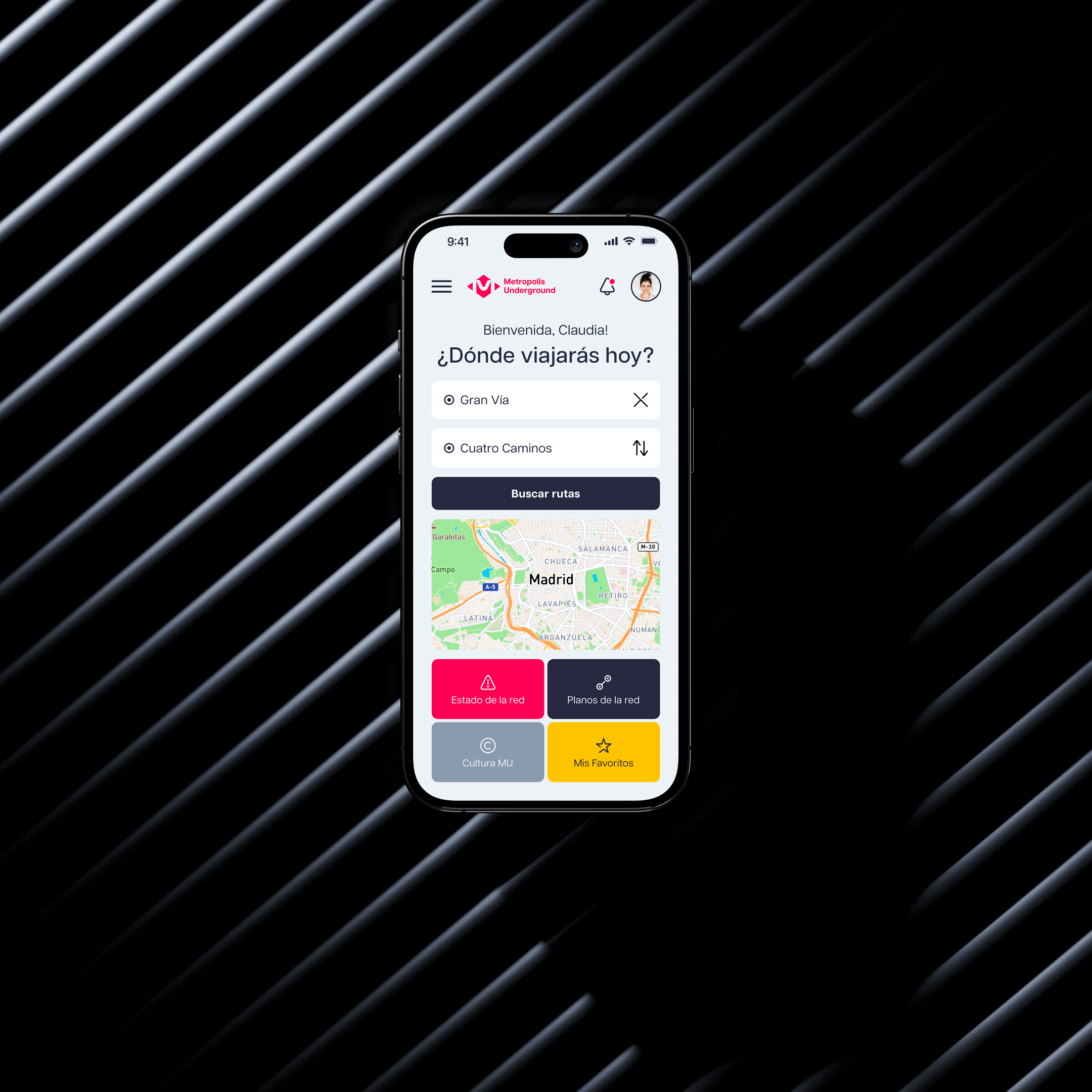Además, se diseñó un concepto para una app de movilidad que permite a los usuarios consultar el estado del sistema, recargar sus tarjetas de transporte y planificar sus trayectos de manera eficiente y práctica.